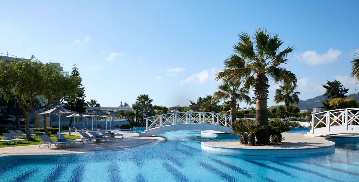 Refreshing and cool, our hotel’s large freeform fresh water swimming pool will become the center of your Electra Palace Rhodes summer. With its islet and bridges, surrounded with grass and palm trees, dotted with comfortable sunbeds and umbrellas and serviced by the H20 pool bar, our Rhodes hotel pool is every guest’s favourite, no matter what their age is!