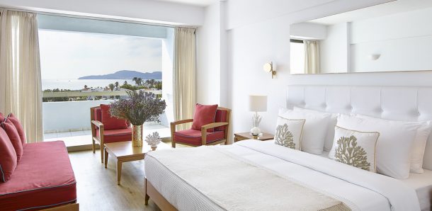A recently updated guestroom, offering a spectacular view of the Aegean Sea and the resort’s water features.