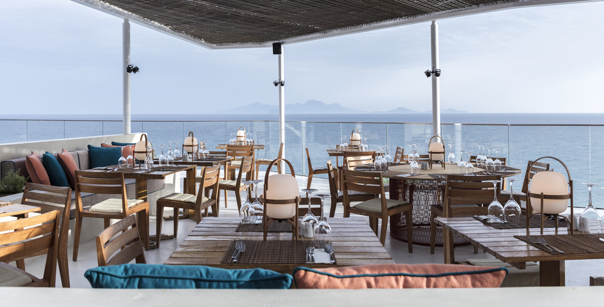 Lunch is served from 12:30 to 14:30 and dinner from 18:30 to 21:30. The main restaurant offers local and international cuisine, as well as show cooking. Enjoy the magnificent view over the Aegean & Nissyros island, while tasting the delicious specialties carefully prepared by our Chefs.